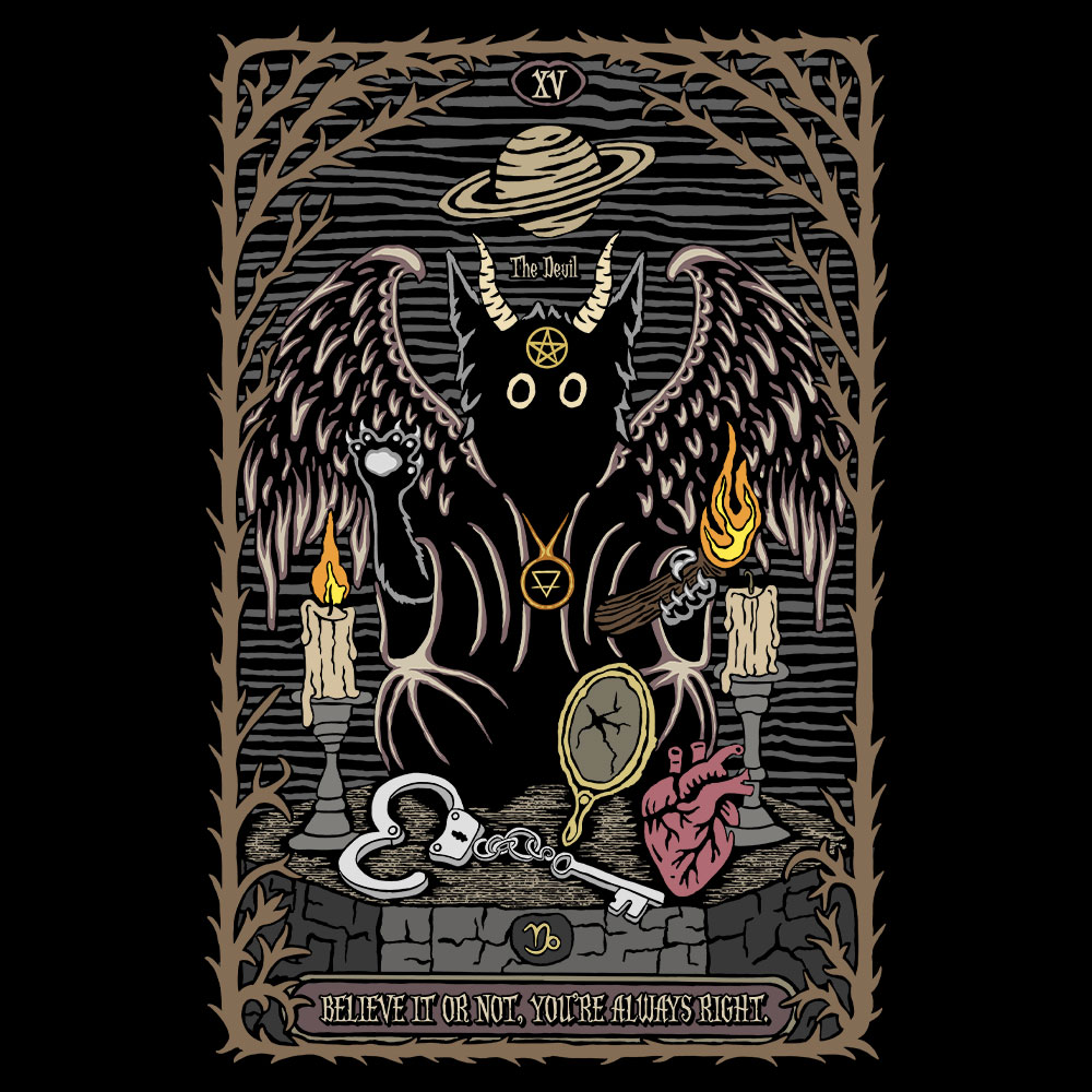 A catlike Devil, winged and wicked, declares: “Believe it or not, you’re always right.” Tarot symbolism for the quietly rebellious.